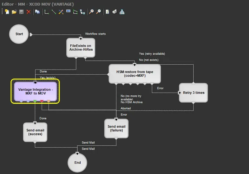 Etere can trigger Vantage transcoding T-workflows and get progress and status updates. Etere provides the capability of creating custom "Vantage integration" actions to request -via T-workflow.