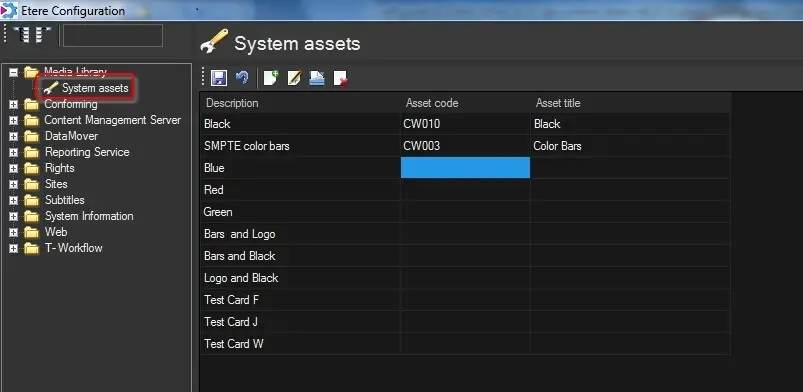 The System Assets section allows, as its name suggests, defining a set of particular assets (e.g. black video, colour bars, etc.) intended to be used for system scopes (e.g. conforming):