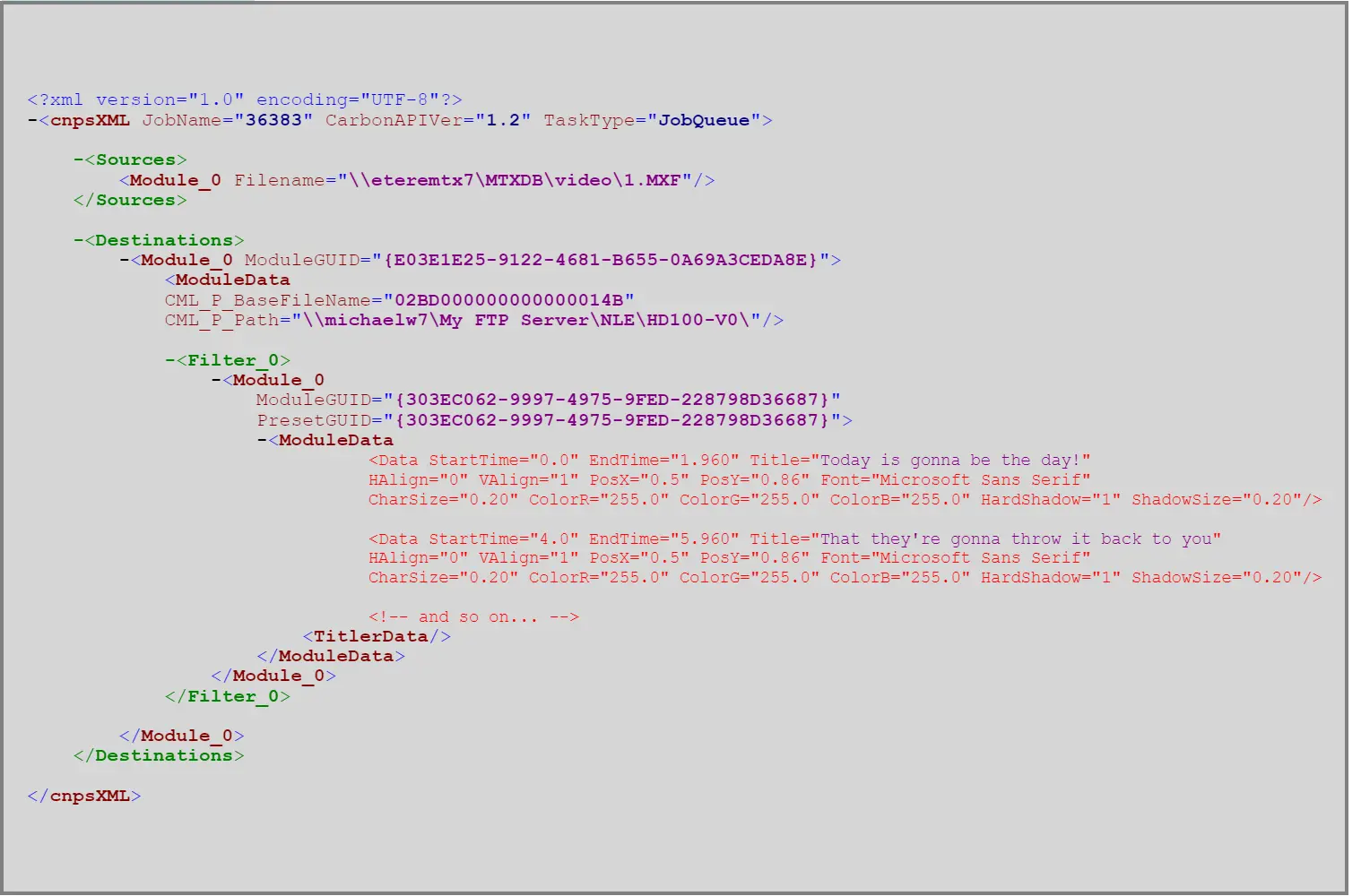 In case of using a custom destination, subtitles can be manually inserted in the main XML by replacing the Filename parameters with the correct subtitle data: