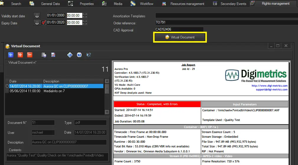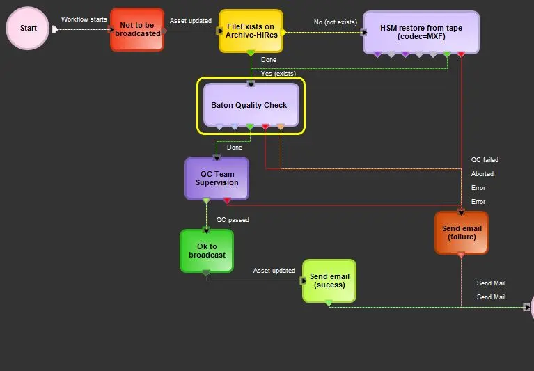 Etere provides the capability of creating custom "Baton integration" actions to request -via T-workflow- the execution of verification tasks based on Baton test plans for media files stored (or being streamed) on Etere metadevices: