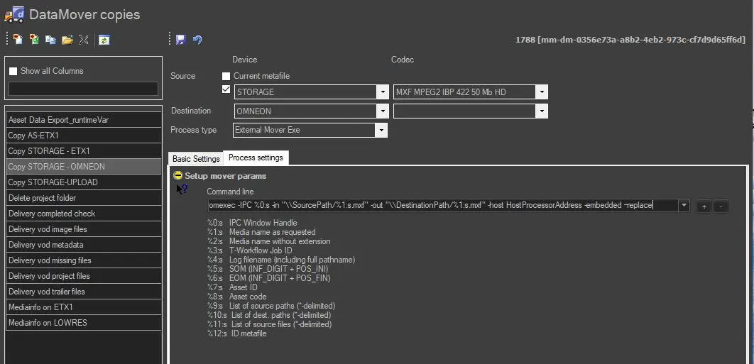 omexec -IPC %0:s -in "\\SourcePath/%1:s.mxf" -out "\\DestinationPath/%1:s.mxf" -host HostProcessorAddress -embedded –replace