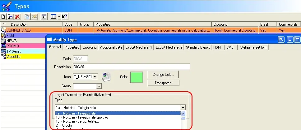 The very first step on preparing the creation of an Events Log Report consist in enabling the asset types that will be included in the report, this, by assigning specific "ministerial types" under the Etere Configuration > Settings > Types > General section: