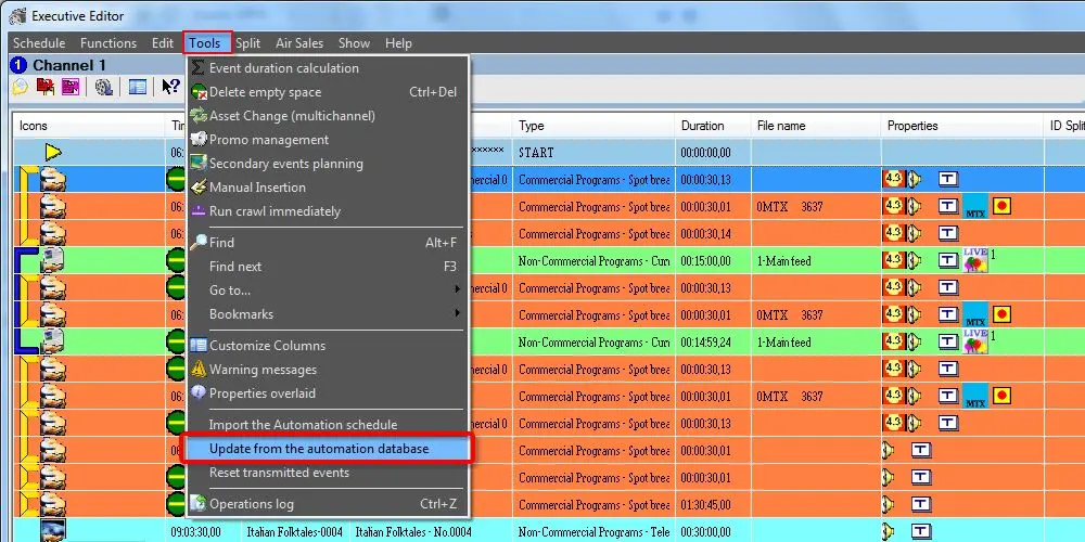 Before generating the report, it is required to first update the actual times of all transmitted events, this, through the "Update from the automation database" scheduling function from Executive Editor: