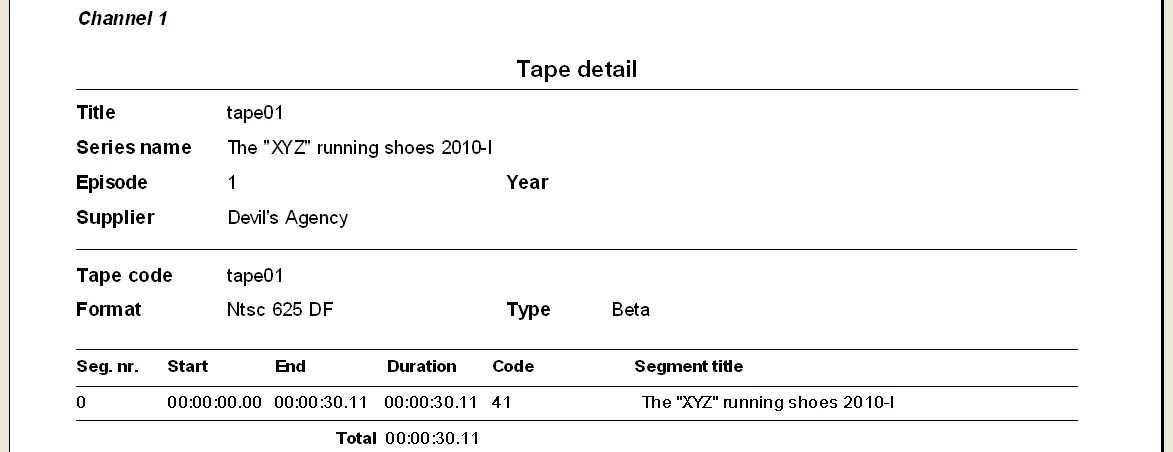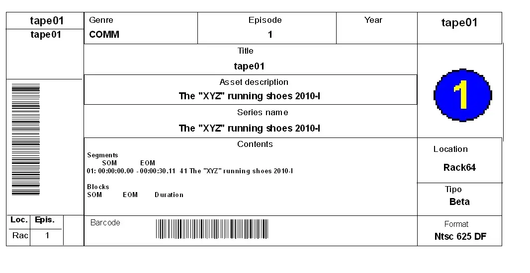 The Tape Labels report allows the print of a detailed document containing all those assets stored within certain tapes; for each asset, various information will be displayed, including genre, episode, description, rack location, tape code, tape type, tape format, etc.