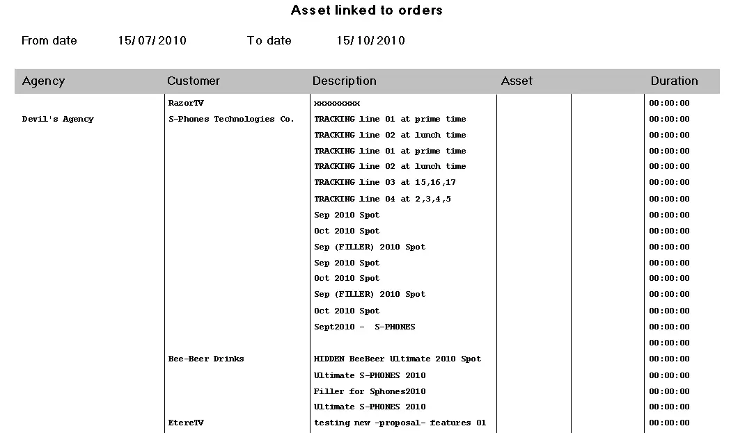 This report will retrieve all commercial orders valid for a specific date range, detailing the related 'agency', 'customer', 'description', 'asset' and 'duration'.