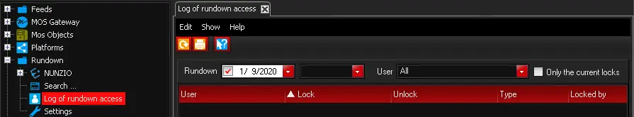 In the Rundown node, you can use the Log of rundown access sub-node to generate a report with the same name to determine and manage the rundown locking status.