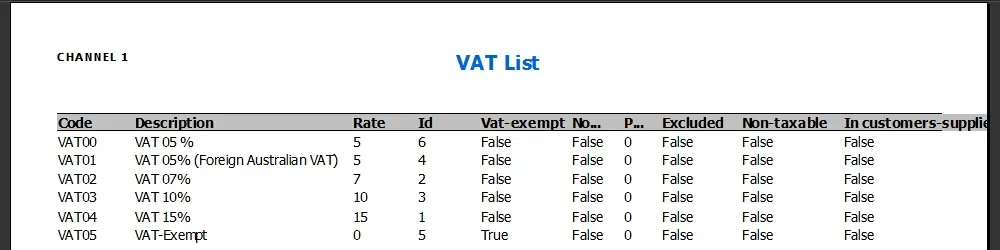 VAT codes are user-defined in Configurations/Invoice Archives/VAT Codes, and this report allows you to produce a list of all or some of these codes based on your search criteria.