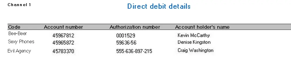 Using various standard criteria, the Direct Debit report allows you to produce a list of all direct debit details of a certain company, company, person, or people.