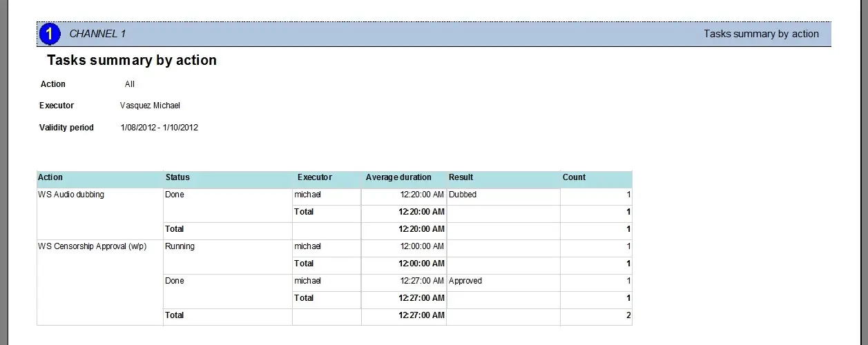 The Task Summary by Action report allows for generating a document containing detailed information (executors, status, durations, results, etc) on all the selected worksheet actions.