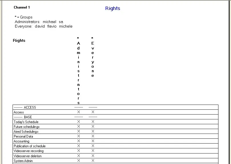 This report allows you to print all the rights available for either users or groups; you may choose among the suitable types, only those you are interested in printing.