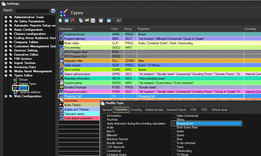 •Show Properties: This option allows the user to display properties associated with each type.