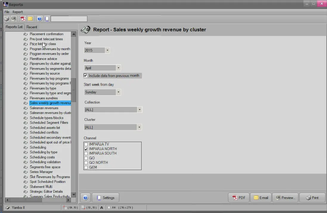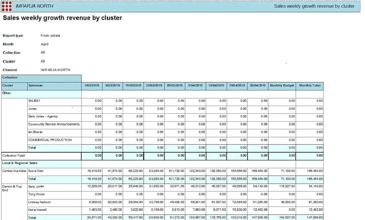 This report captured the weekly sales growth for the current month, with an option to include the weekly sales data booked by the account executive of the previous month for comparison. The weekly total revenues of the last month and the weekly total of the current month in this report should tallied with the monthly totals of the previous month and current month captured in the report "Account Executive Revenues by Cluster". This report can be triggered from one station and multiple combined stations.