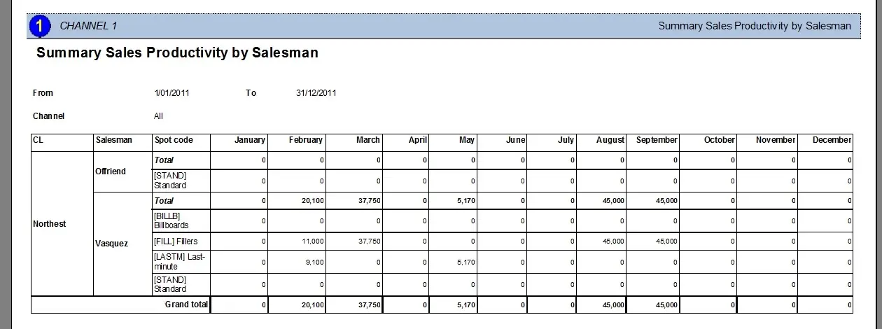 The Summary Sales Productivity by Account Executive report allows the generation of a document containing the monthly revenues earned by the television station in a particular year from a specific account executive, making it possible to narrow the report to only those revenues incoming from specific channels, spot codes and classifications.