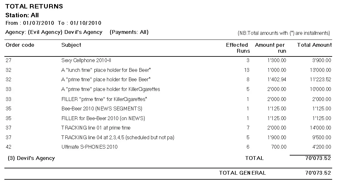 - Global report by order/subject: A table containing all the revenues derived from all the orders invoiced within the selected date range,