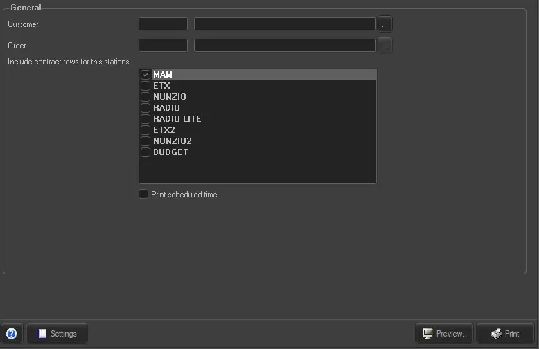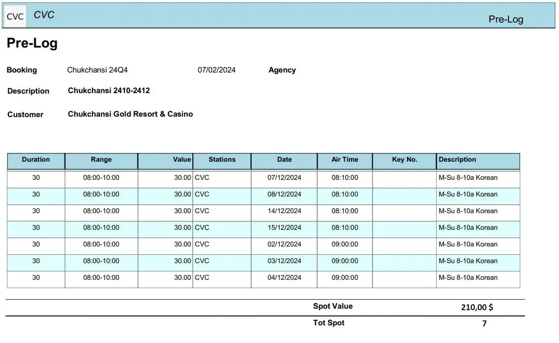 The Pre/Post Log times report allows the generation of a document containing a chronological list of all the events of a particular order scheduled within a certain period, detailing the customer, scheduled time, commercial type, station, asset, duration and price.