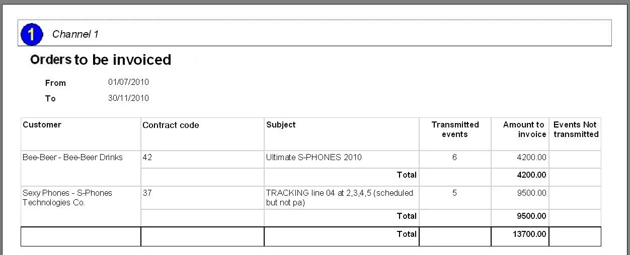 The Orders to be Invoiced report allows the generation of a list of all the orders scheduled to be invoiced within a given period, detailing the customer to which the invoice is related as well as the subject, invoice amount, number of transmitted events, etc.