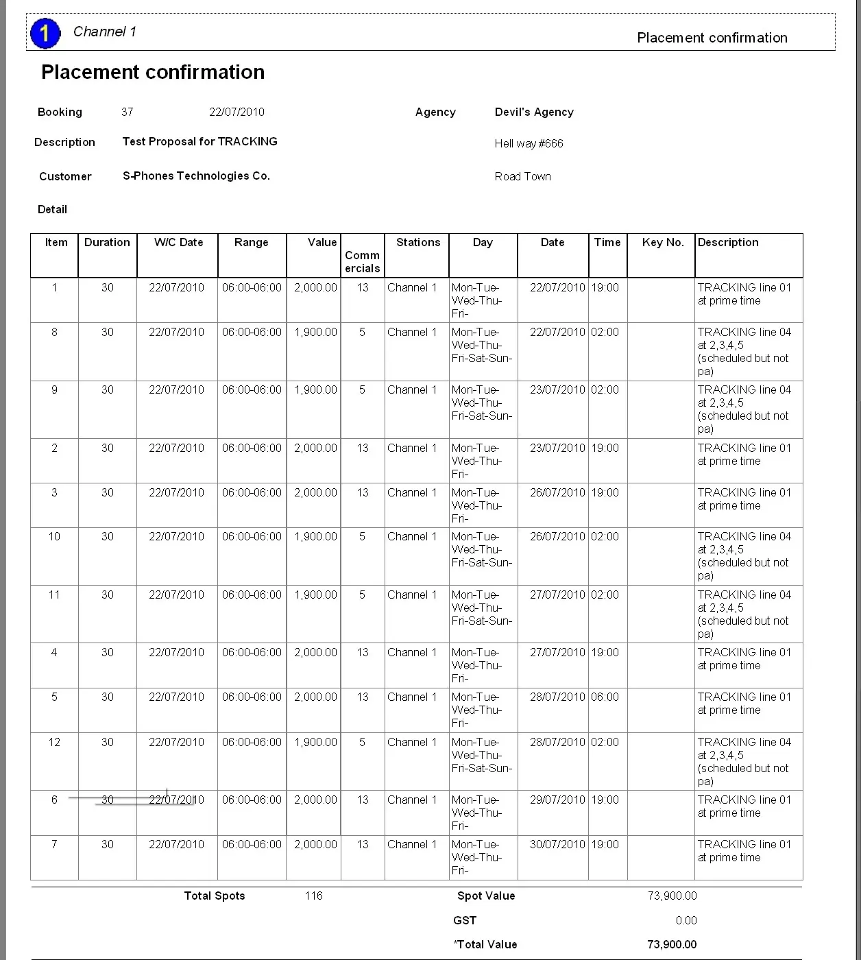 The Placement confirmation report allows the generation of a document containing all the scheduled events derived from a particular contract, in order to evaluate if their placement is correct and satisfactory.