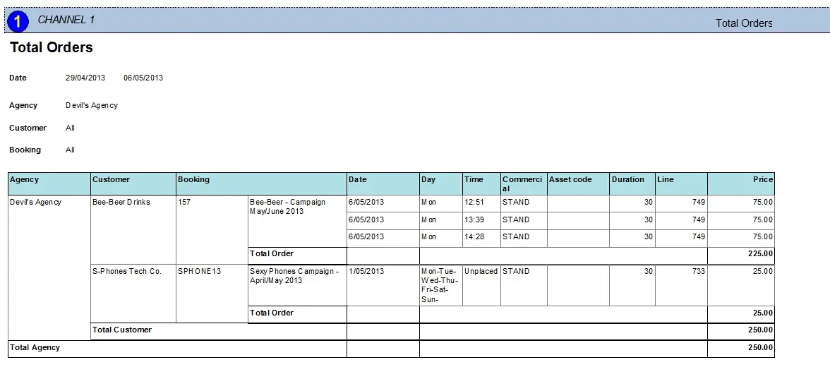 Commercial events presented in this report will be grouped by order line, then by order, by the customer and finally by agency, displaying a total amount for each grouping level.