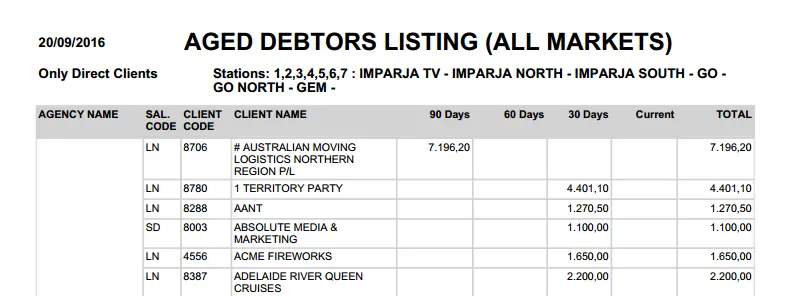 The Debtors List report allows the generation of a document containing a list of all unsettled aged invoices grouped by customers and separated by agencies, dividing all debts into four monthly periods: current month, last 30-60 days, last 60-90 days and over 90 days.
