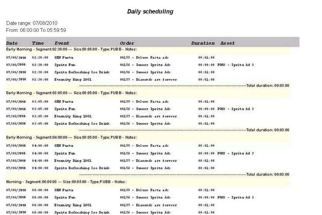 The daily scheduling report allows the view of all the commercial scheduling made in a particular time frame, permitting the setting of sort parameters based on the event type, time slot, date, and type.