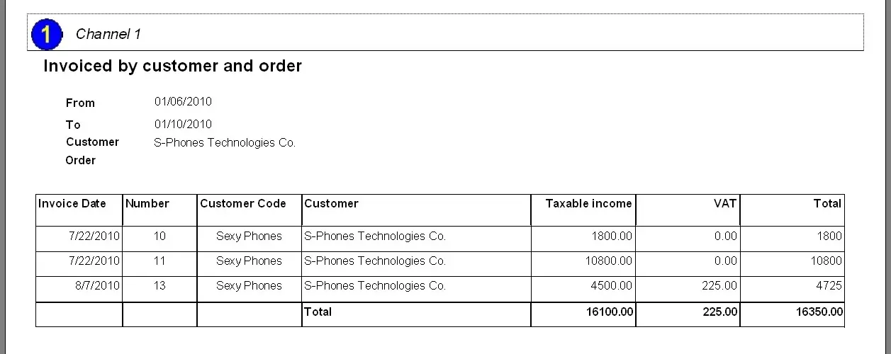 The invoice by customer and order report allows the generation of a document containing all the invoices created within a certain period for a specific customer, making it possible to narrow the information to a specific order.