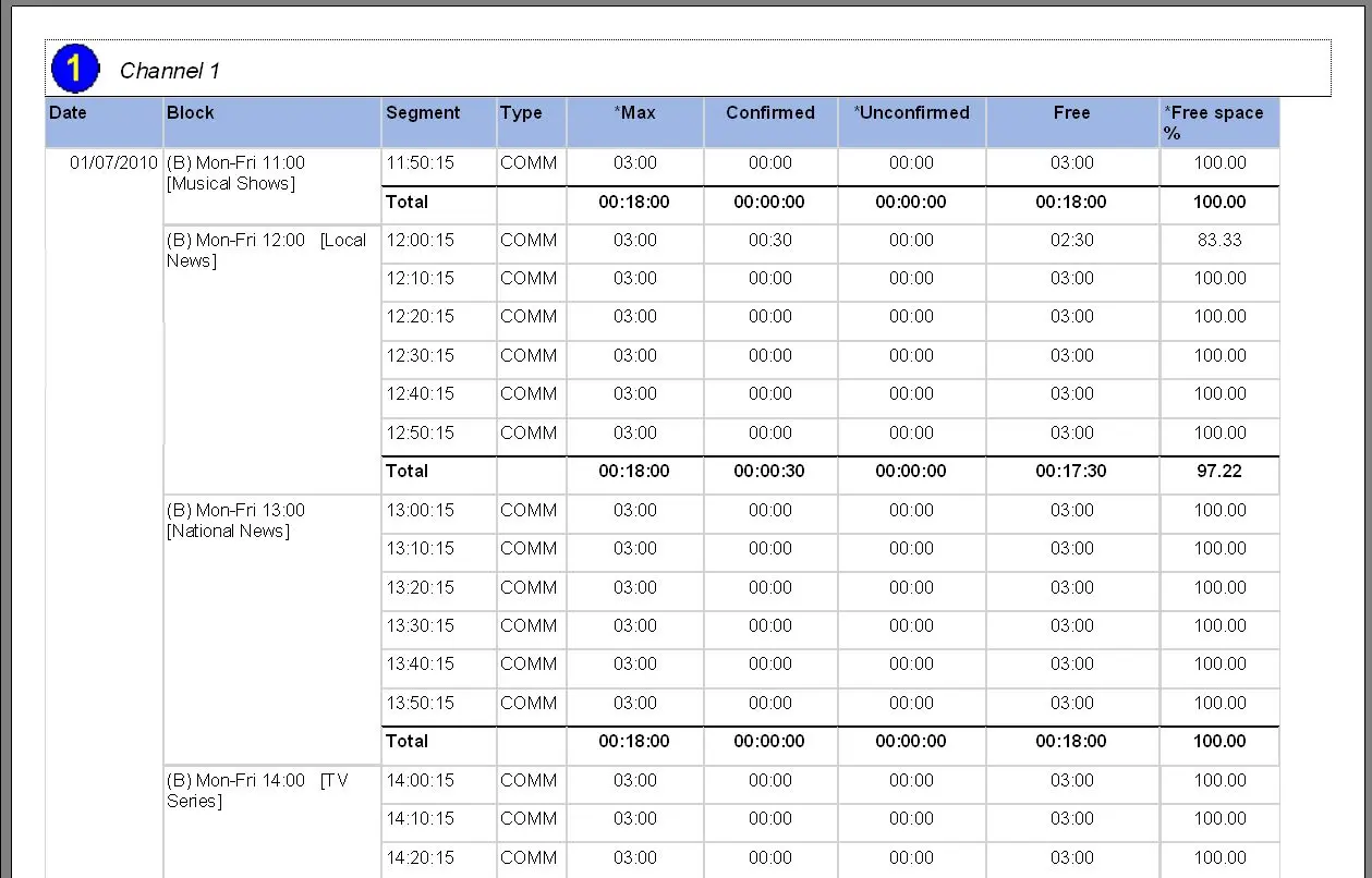 The Segments Free Space report allows the generation of an extended document containing all the scheduling clusters present in a specific time range; the information will detail the date, block name and exact slot of the cluster, as well as its scheduled space and confirmed space.