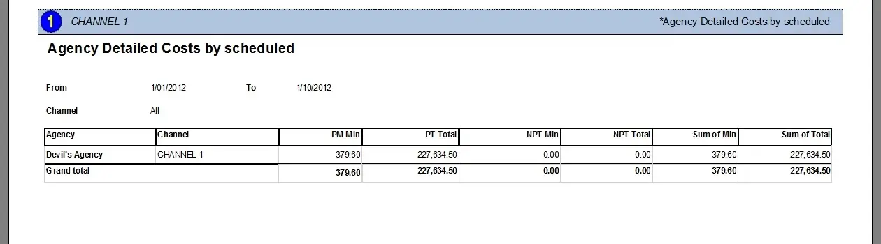 The Agency Detailed Costs by scheduled report allows the generation of a document containing all the costs (commissions) derived from the transmission of commercial orders; grouping said charges by agencies and classifying them by prime time and non-prime time slots.