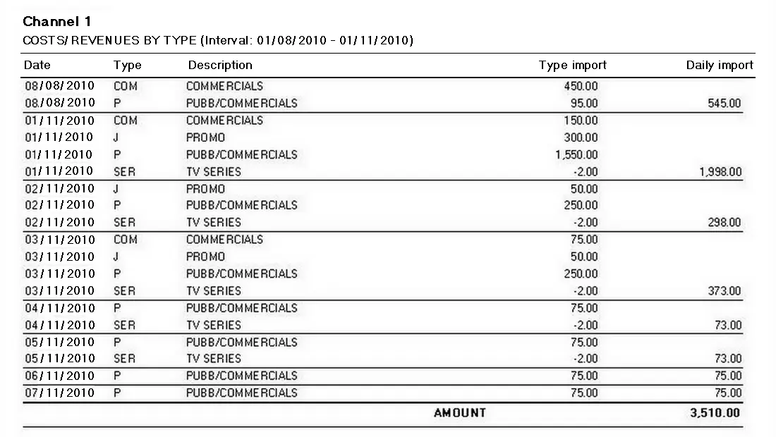 This report allows the generation of a document containing all the data required to analyze the daily return of a particular type of event detailing a total sum of the period specified.