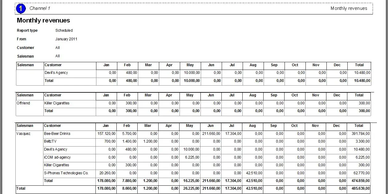 The Monthly revenues report allows the generalisation of a document containing the revenues of the last twelve months starting with the month specified by the operator, making it possible to filter retrieved data by customer and account executive. Moreover, the account executive can organise the data for a more customised result.