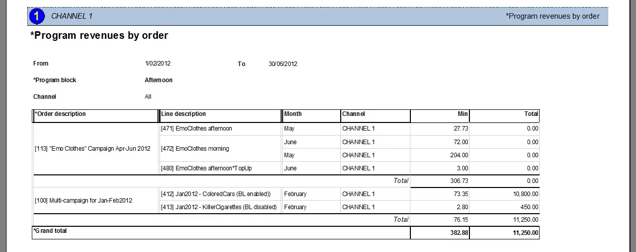 This report is helpful to, for example, analyze the revenues earned from specific orders scheduled on a particular program's time slot.