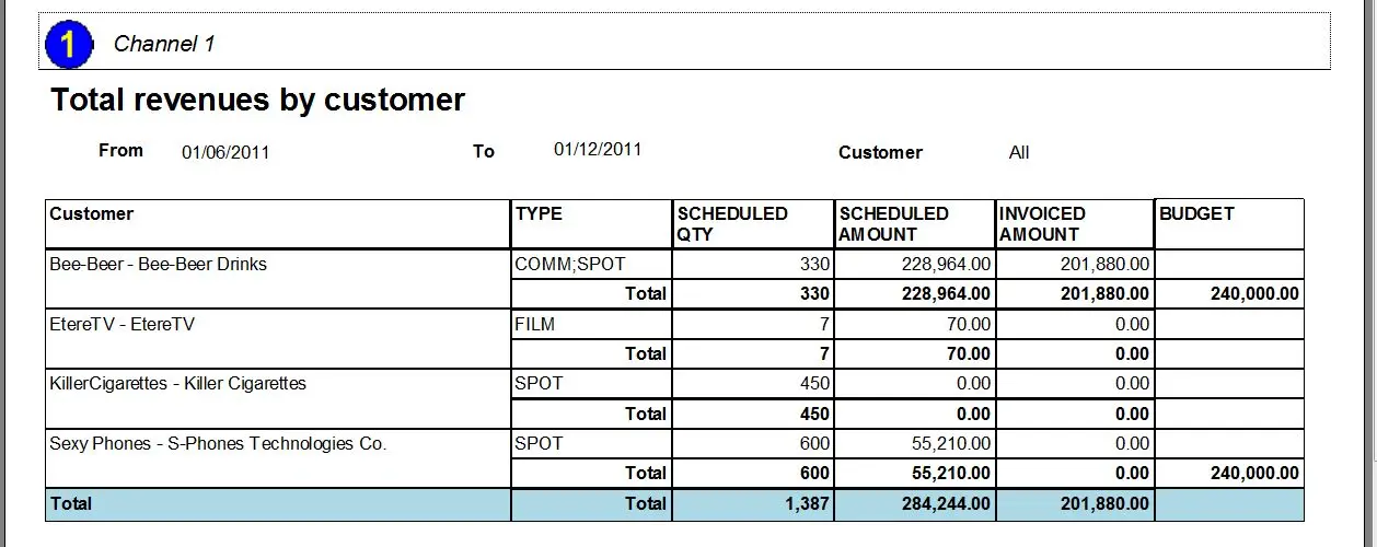The Revenues by customer report generates a document containing a detailed report of all the revenues collected by a specific customer; this report will detail the quantity and amount of scheduled events, the total invoiced amount and the budget assigned to the customer in question.
