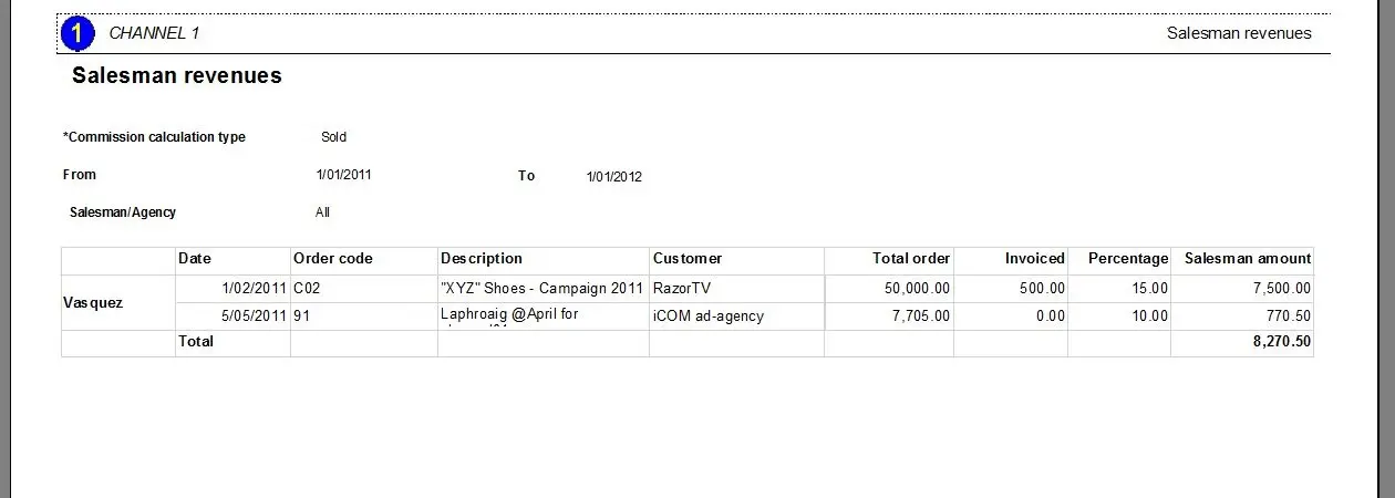 The Account Executive revenues report allows the generation of a document containing the incomes earned by a specific account executive over a certain period by calculating revenues from the scheduled orders related to that account executive. The elaborated report will detail each order, its total expected amount, total invoiced amount, agency/account executive percentage, and the due commission, as well as display the total commissions scheduled for that period.
