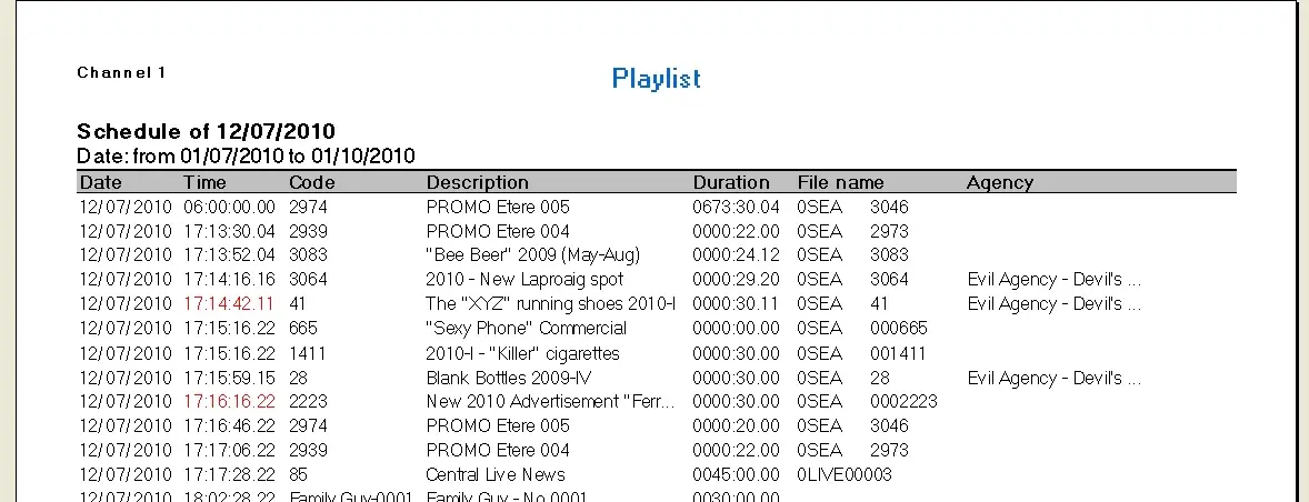 The Playlist report allows the generation of a document containing the automation schedule the same as the one programmed in Etere; this report allows the search of a wide range of filters to generate a fully suited report.