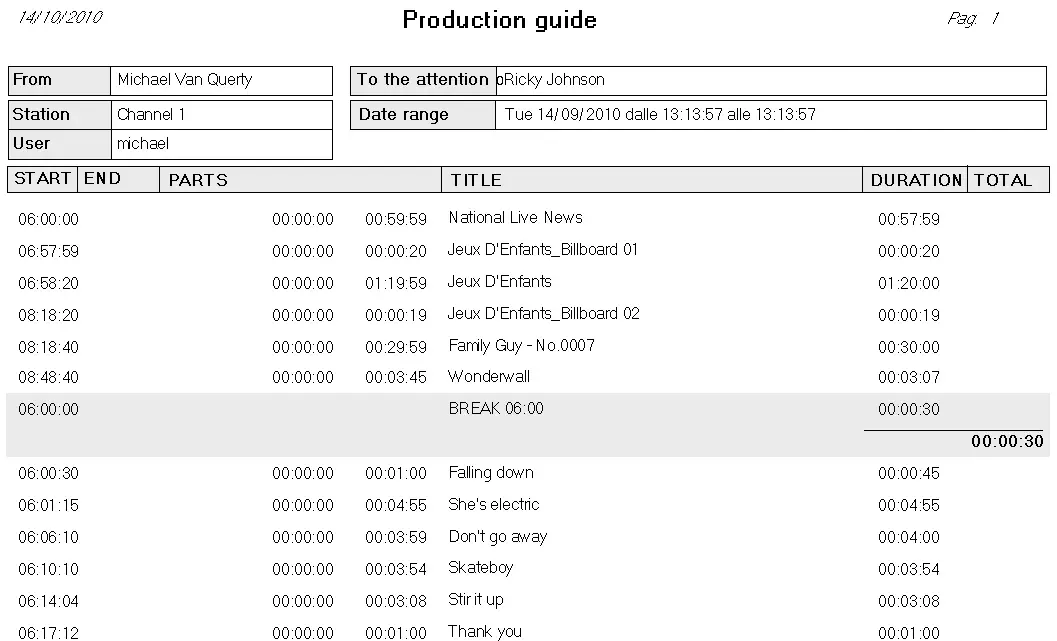 The Production Guide report allows for generating a document containing a certain schedule type for a specified period, and it is also possible to narrow the report to a specific time segment.