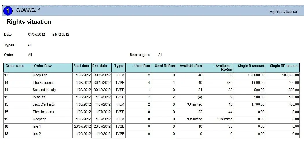 The Rights Situation report allows to generate a document containing all rights used (or available for use) by programs within a certain period, allowing to filter them -besides from right and period- also by asset type and source order. This report is an inventory situation useful to keep track on the use of rights.