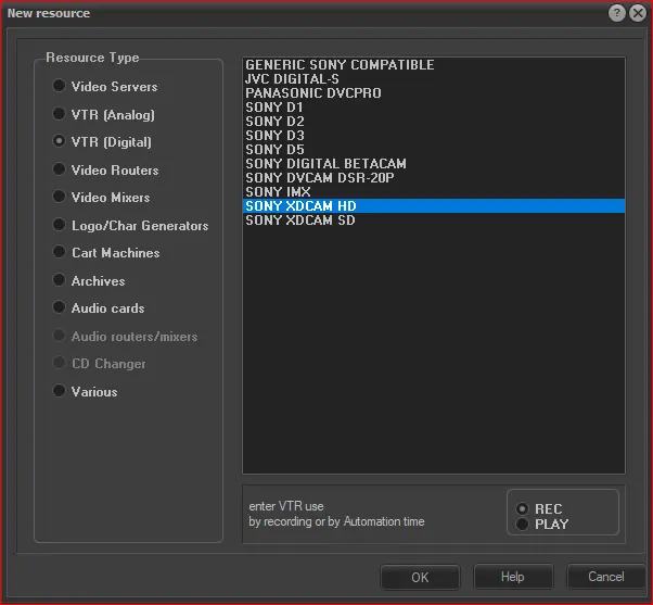 Select Add Resource à Digital VTR à Sony XDCAM HD or SD (choice between High Definition and Standard Definition).