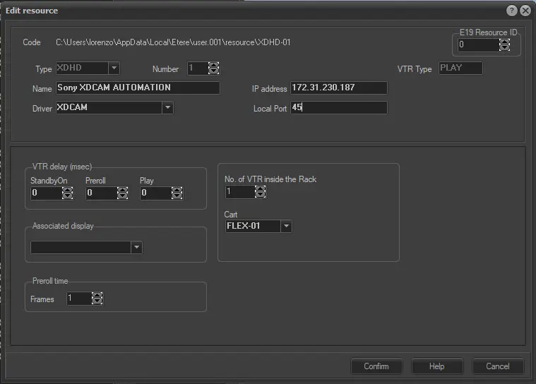 •Driver: specify the driver for the Resource (default set at XDCAM)