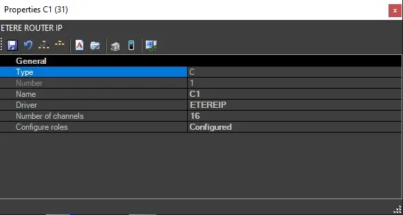 - Configure roles: You can assign a configuration role to the new router. Click on the icon on the extreme right to open the Properties window. From the lower panel, select the stations, the etere PCs, and the module you want to assign the Etere router IP to, then click the Save button to confirm the role assignment.