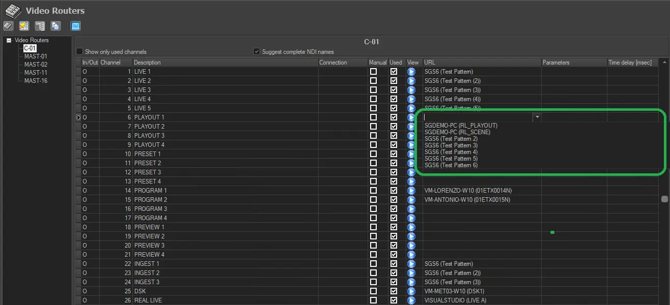 From the "URL" column, click the drop-down button to view all available NDI streams running on the network and select a custom NDI stream for the In/Out channel. After selection, the NDI stream URL will automatically populate if empty in the Channel Description column. Otherwise, you can put the description you want. In both cases, Description=Url or Description≠URL, the NDI stream will be available to use inside the Etere System.