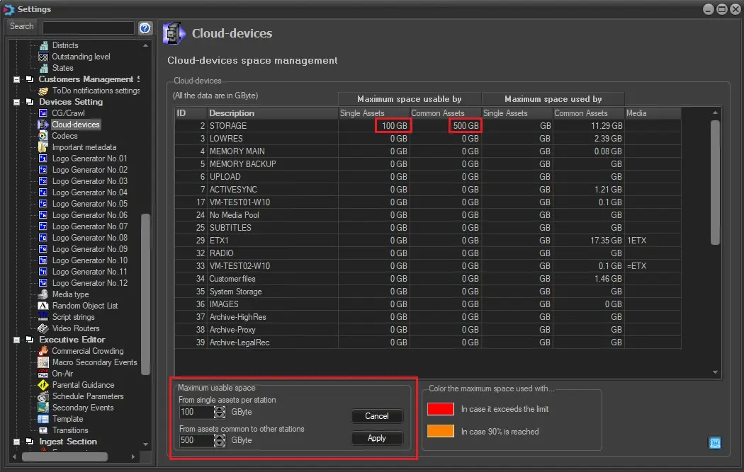 Etere Configuration allows you to set the maximum space that a meta device can use for storing data; this feature is helpful if you want to prevent undesired capacity-related issues. By selecting the limits, the user would be warned when the storage device is reaching its assigned capacity and when it exceeds the capacity.
