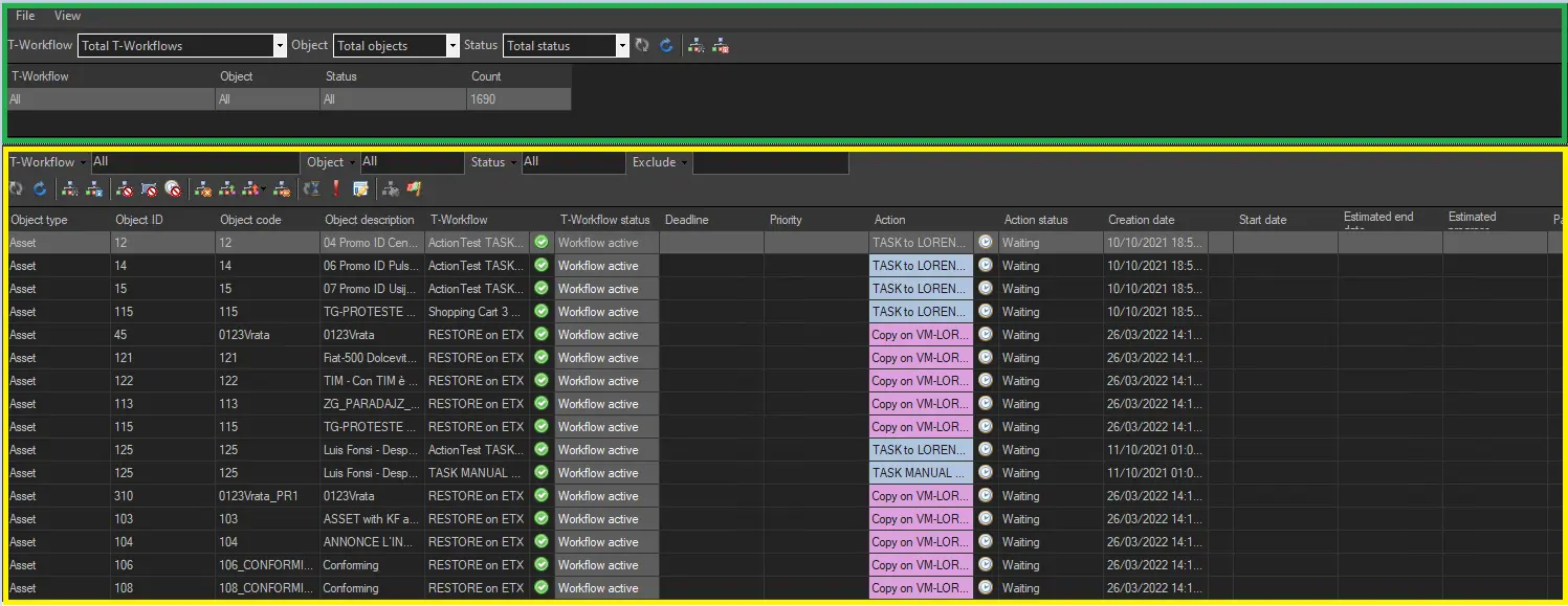 For each T-workflow action displayed here, it will be detailed its "Object type", "Object ID", "Object code", "Object description", "T-workflow", "Workflow status", "Deadline", "Priority", "Action", "Action status", "Creation date", "Start date", "Estimated end date", "Estimated progress" and "Parameters".