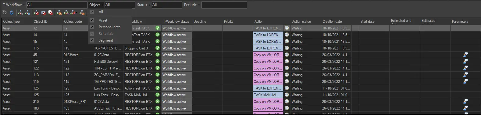 Object - Specify the entity (i.e. asset, segment, schedule, personal data) to which the T-workflows to be processed are attached and launched:
