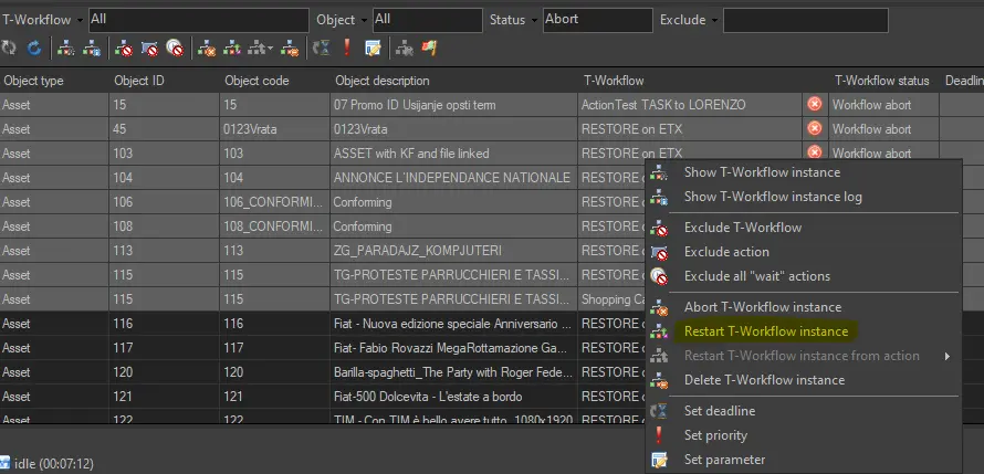 3. In the "Details Panel", select all the T-workflows instances to be resumed, like the Restart workflow instance or Restart workflow instance from action from the right-click contextual menu: