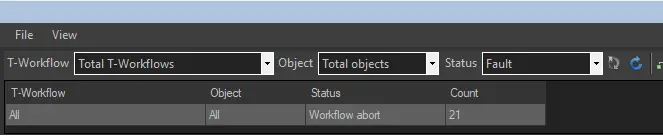 1. In the Master panel, filter the T-workflow(s) by Status=Fault. Click on the Refresh button,n and matching T-workflows will be displayed individually or jointly, according to the search criteria.