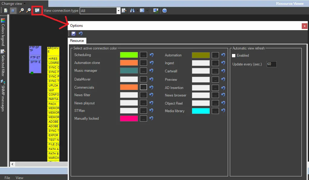 The Options button allows to customize the visualization of connections, specifying their color and auto-refreshing time for showing in real-time all monitored colors using user-defined colors. Options configurable under the "Resource" tab include: