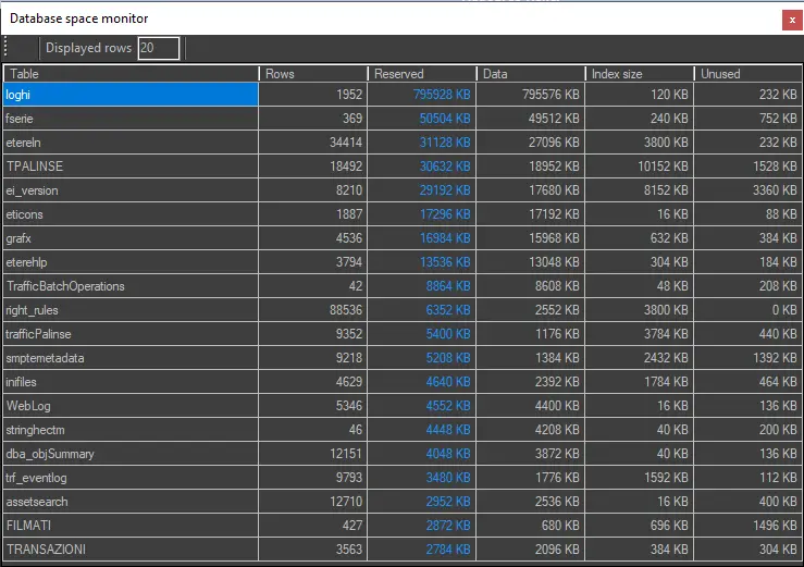 The "Database space monitor" is a useful tool that provides an overview of the database status by allowing one to view the biggest database tables, making it possible to specify the number of tables to display (e.g. top 20) as well as sorting tables by rows, reserved space, used data, index size and unused space:
