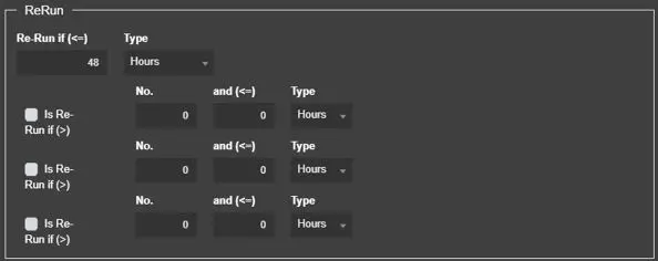 Is ReRun if (>)…and (<=)…: Define up to 3 additional time intervals for a second Run to be considered a ReRun.