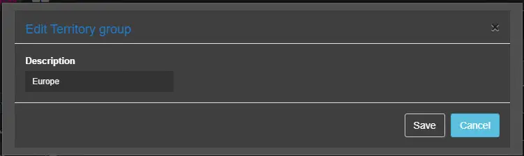 Use the Add Line button to add a new Territory Group to the list by simply entering the name of the new territory group. Once done, click the <Save> button to save the settings.
