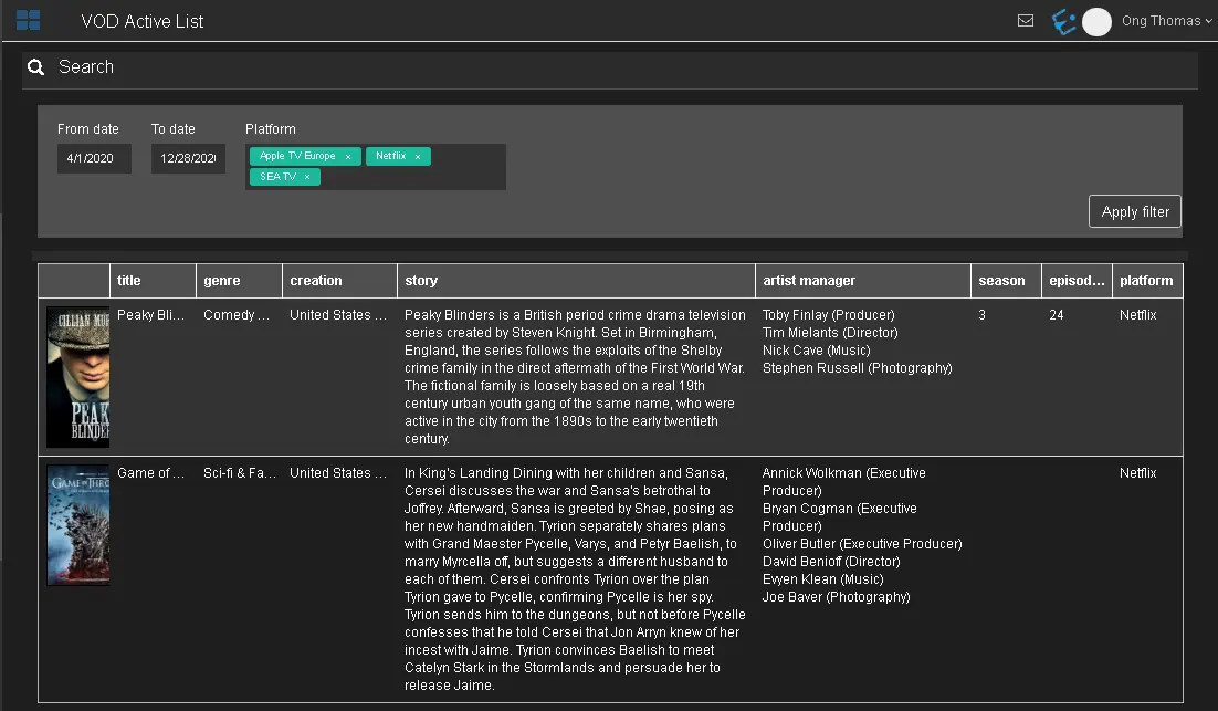 Once the filters are confirmed, click <Apply filter> to extract the active VOD events. The type of VOD events to be filtered would reference the asset Type in Main Data when the contract is created.