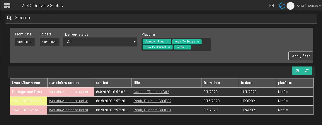 Once the filters are confirmed, click <Apply filter> to extract the VOD delivery workflows that match the filters, along with the related information about the assets, delivery status and so on.